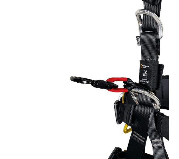 además, dispone de un punto de enganche específico EN 361 LADDER CONNECTION POINT en la parte delantera, bajo el pecho, para la conexión a los sistemas anticaídas EN 353-1, que permite una mayor libertad de movimientos en escaleras y estructuras aseguradas