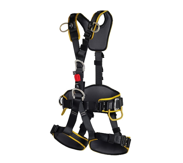 arnés está equipado con los clásicos puntos de sujeción delanteros y traseros EN 361 para la detención de caídas; el punto trasero está empotrado en el acolchado para que no impida el movimiento en espacios confinados cuando no se utiliza